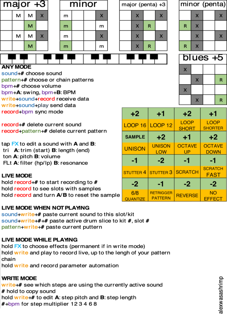 Note: this is not a guide. You’ll find way better guides in the resource list at the end of this post. This cheat sheet is merely a support material that is meant to be printed and stored with your K.O! so that you can always refresh what you’ve learned. It’s not very useful for learning the tracks of your K.O!, it’s useful for actually playing it.